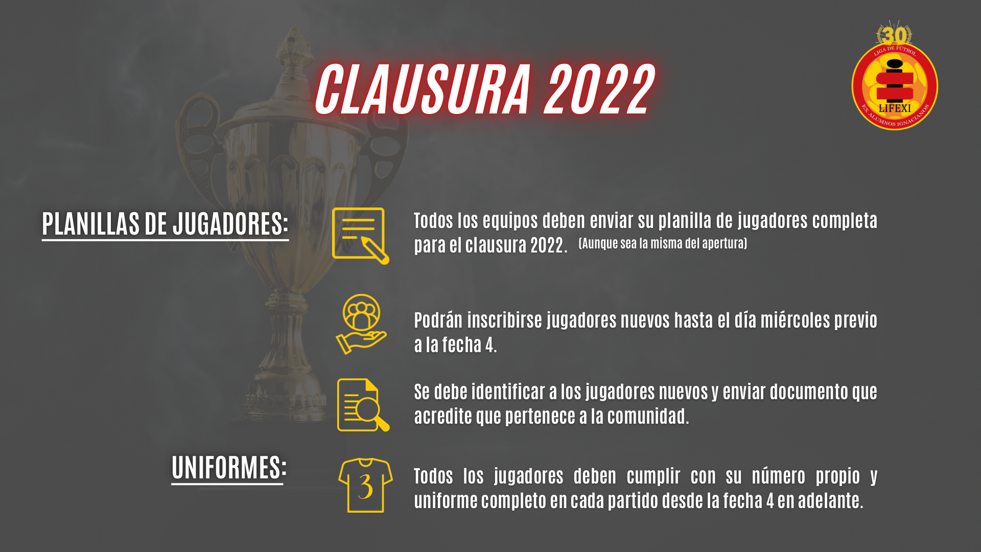 Revisa información relevante respecto a las plantillas y uniformes para el Torneo de Clausura 2022 de LIFEXI.